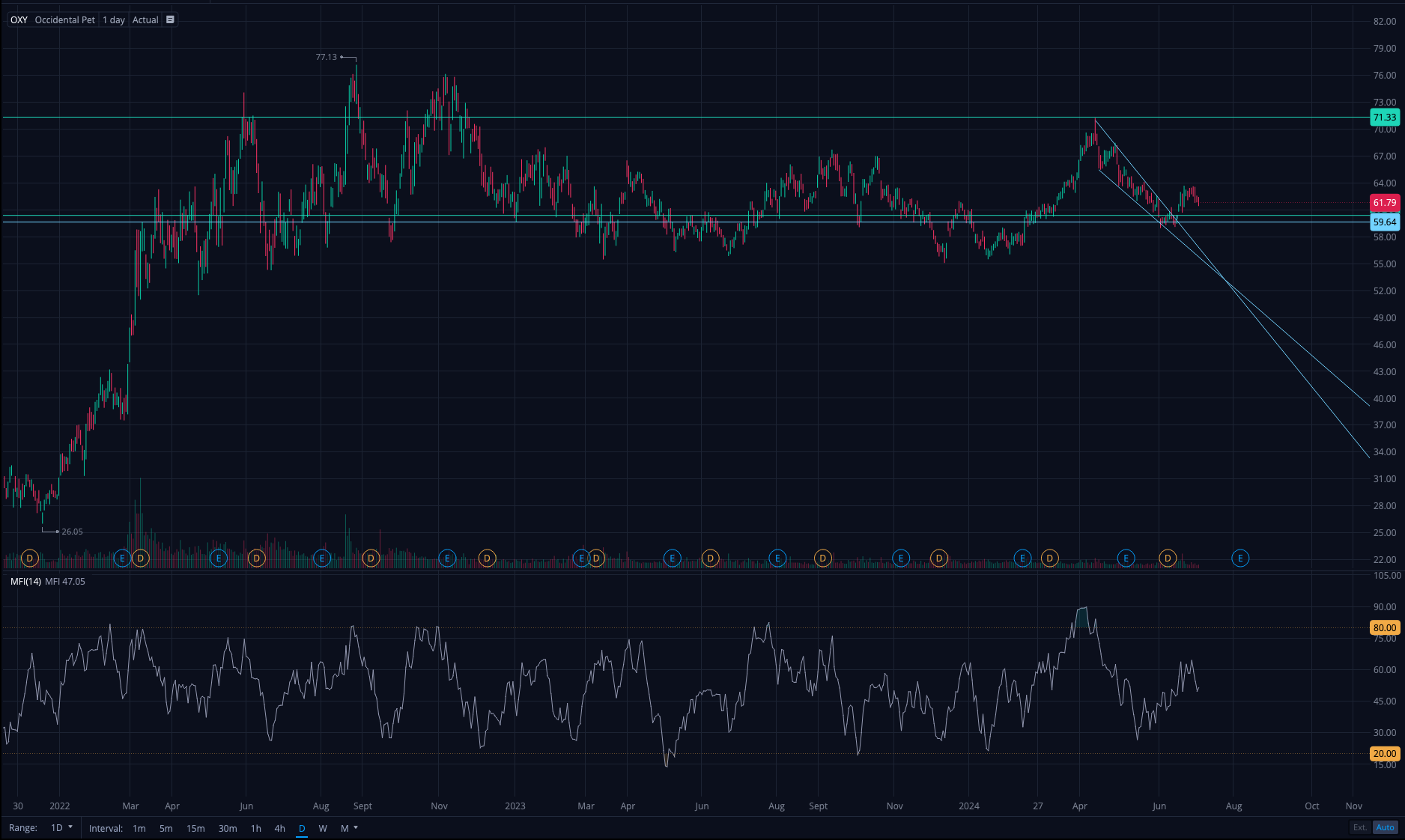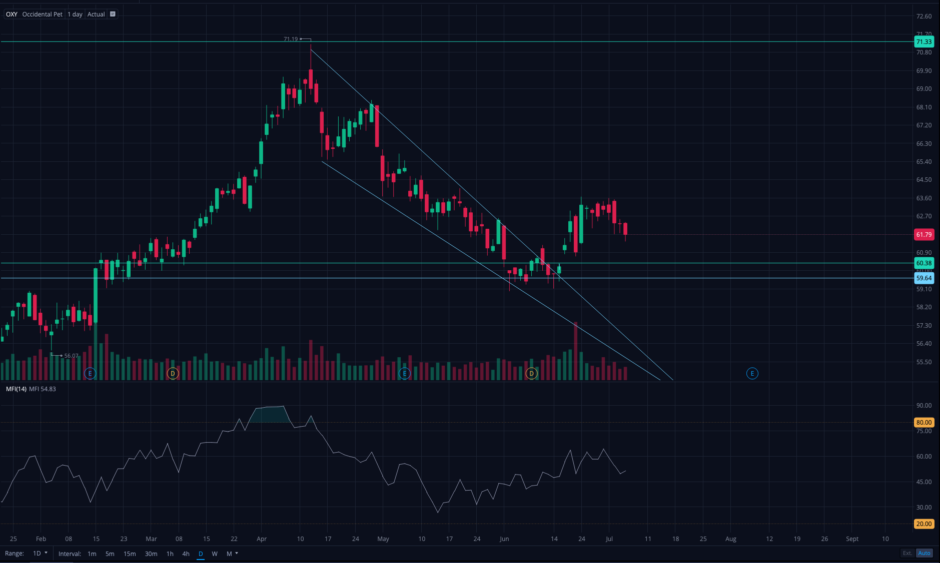 With an apparent floor between $56 and $60 per share and a recent breakout of a falling wedge, OXY looks to be setting up for an uptrend. Recent chart data shows that a run toward $71 per share is on the table (~15% gain), with potential to extend to $77 or beyond.