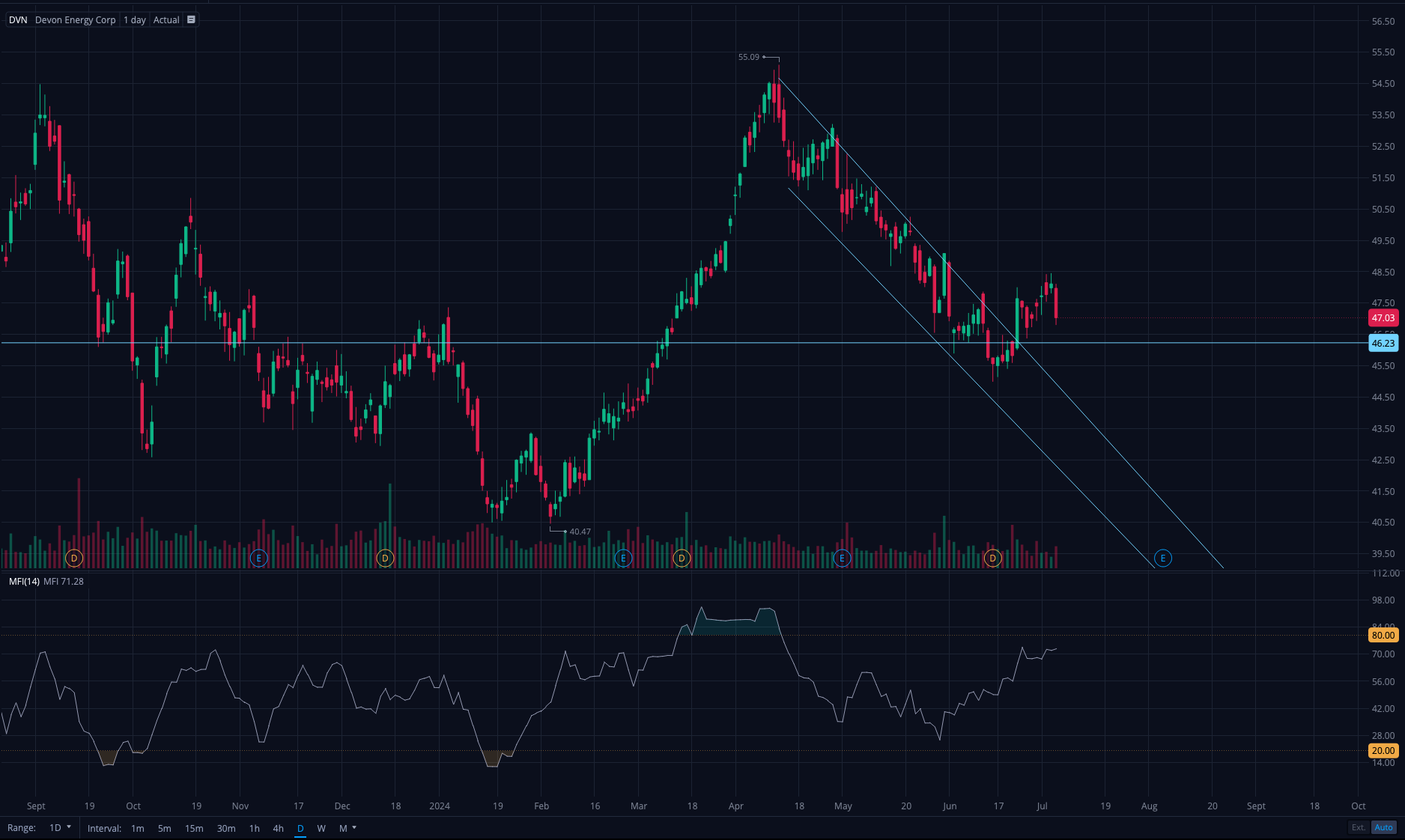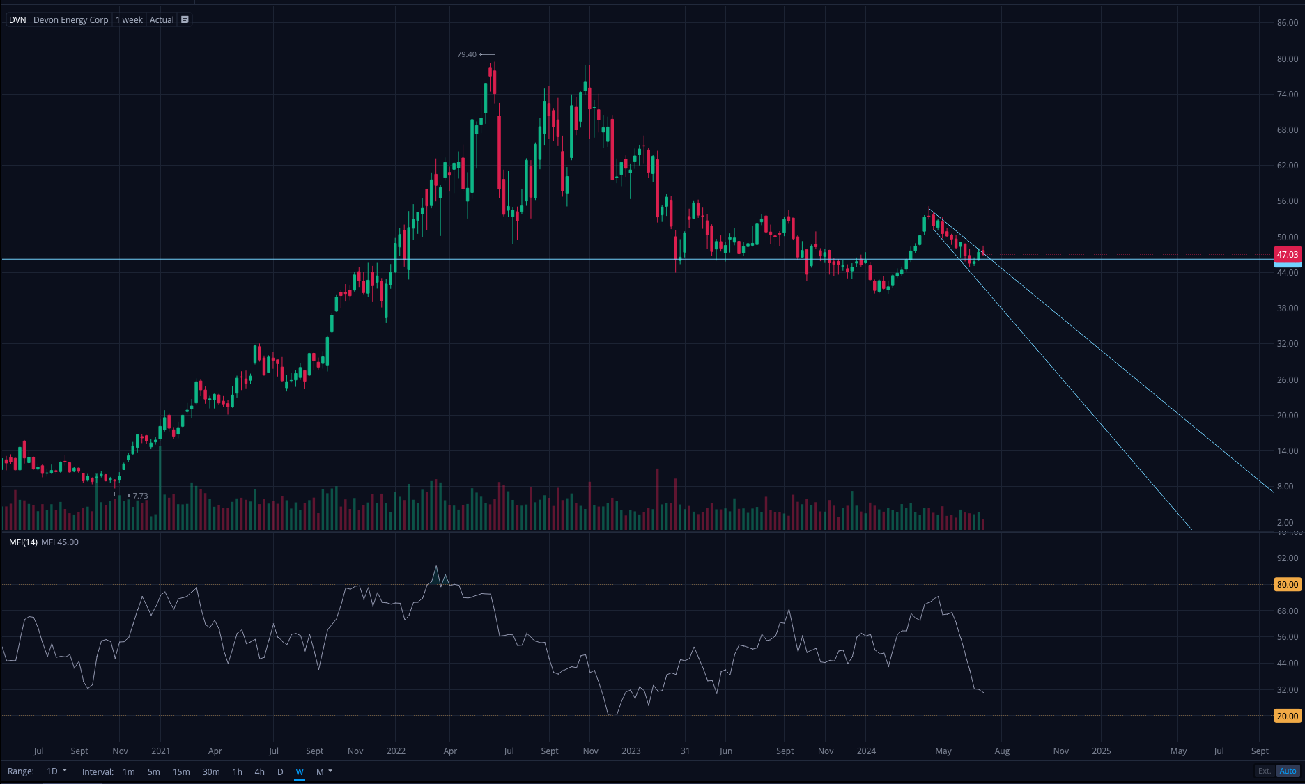 DVN’s chart shows a similar falling wedge breakout, but has a higher potential return if it makes a run at recent highs. Current price is at $47, but was at $79.40 two years ago (~70% gain). While the outcome isn’t certain, I’m confident enough in this setup to start accumulating shares.
