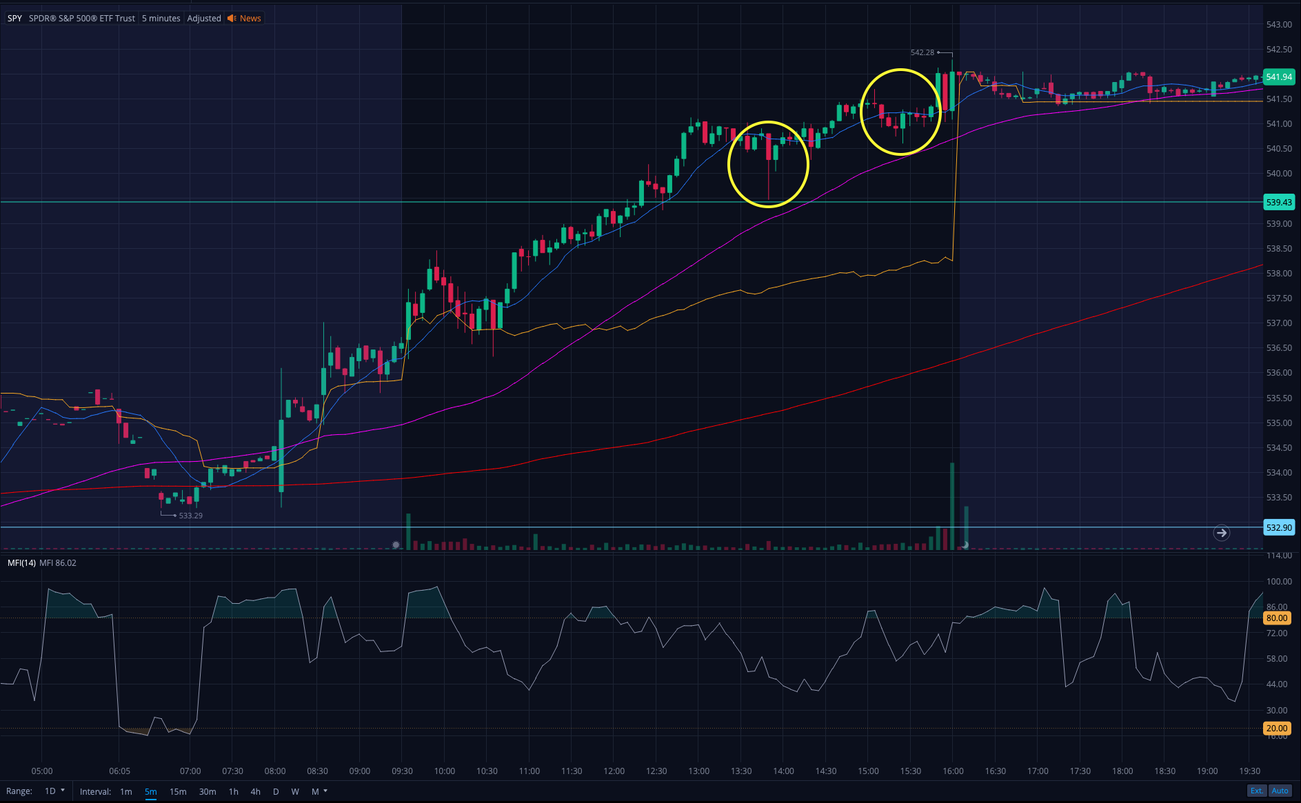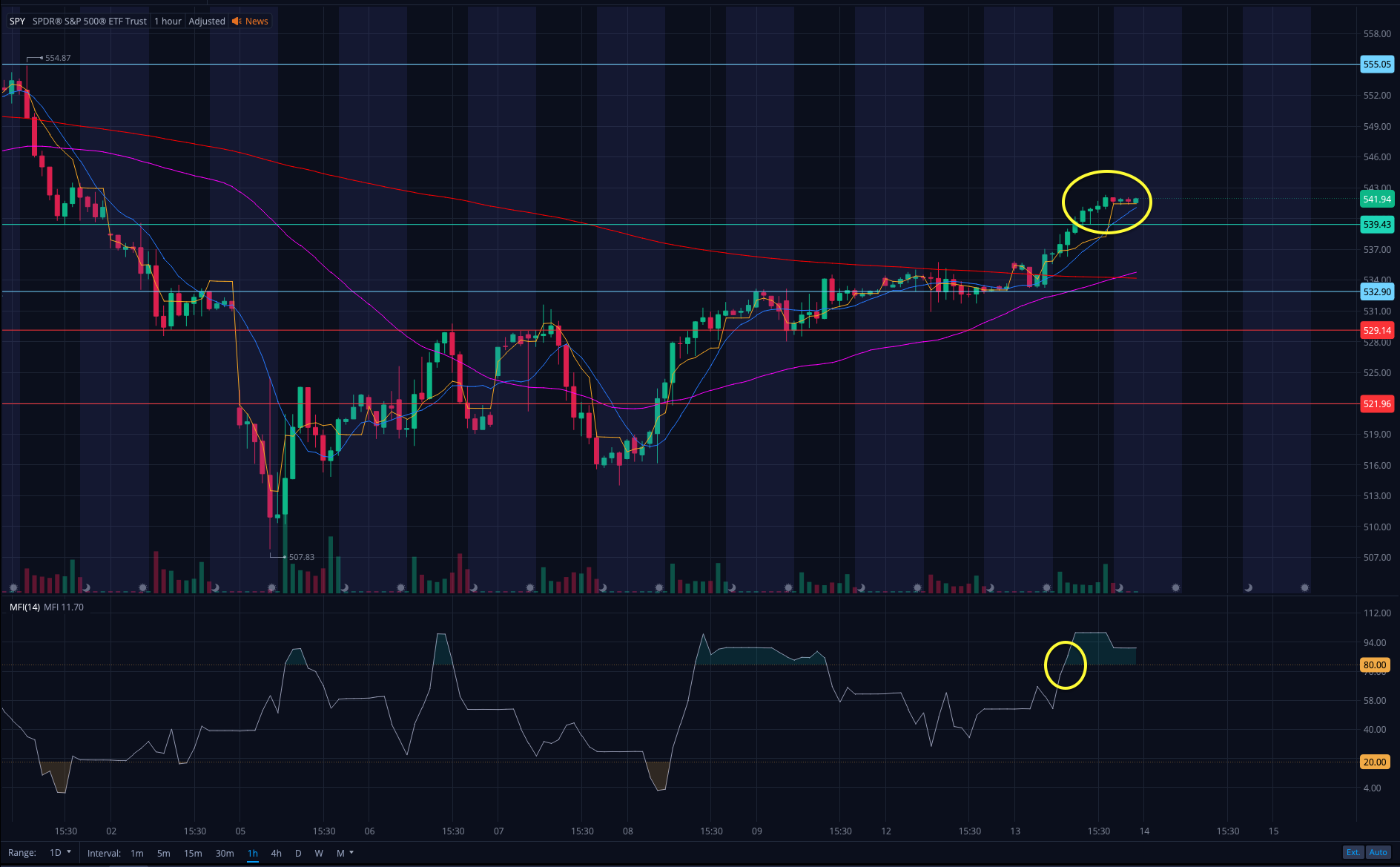 Since the initial rally from November of last year, SPY has shed many technicals in favor of a continuous melt-up. For example, overbought conditions, particularly on the Money Flow Indicator (MFI), haven’t mattered. We saw this twice before the close: once at 1:50 pm EST and again at 3:25.