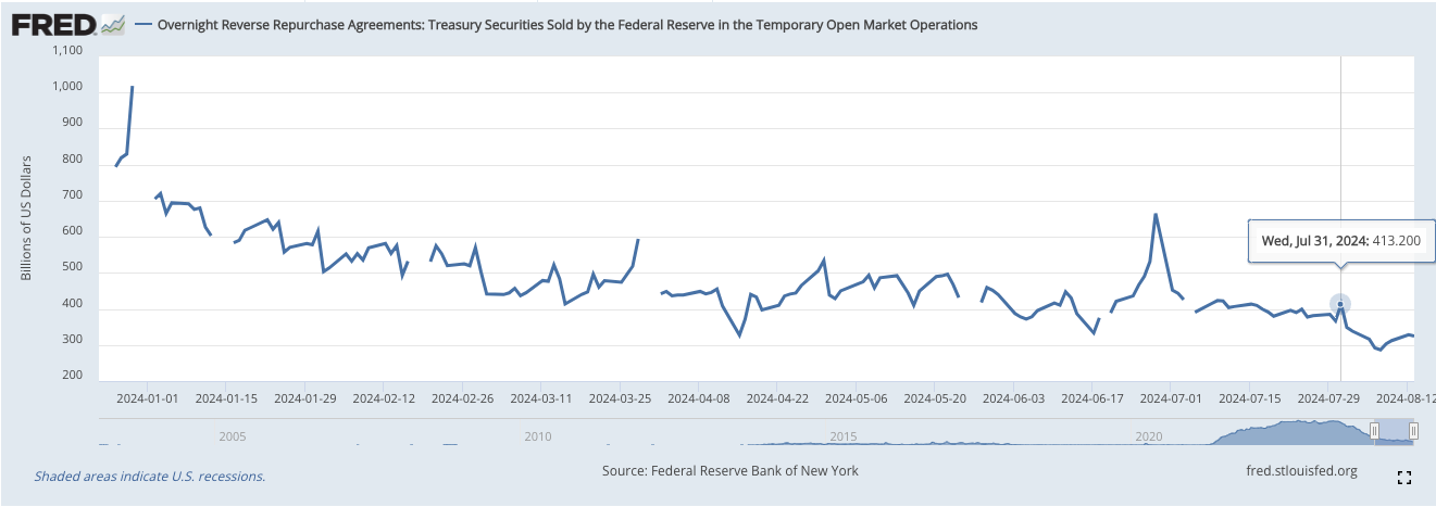 Interestingly, the Reverse Repurchase Agreements (RRP) saw a significant drain from August 1 through August 6, taking it below recent lows. I’ve noticed some traders relying on this information recently to predict market rallies or recoveries. I don’t choose to utilize RRP for trades, but it’s something worth being aware of.