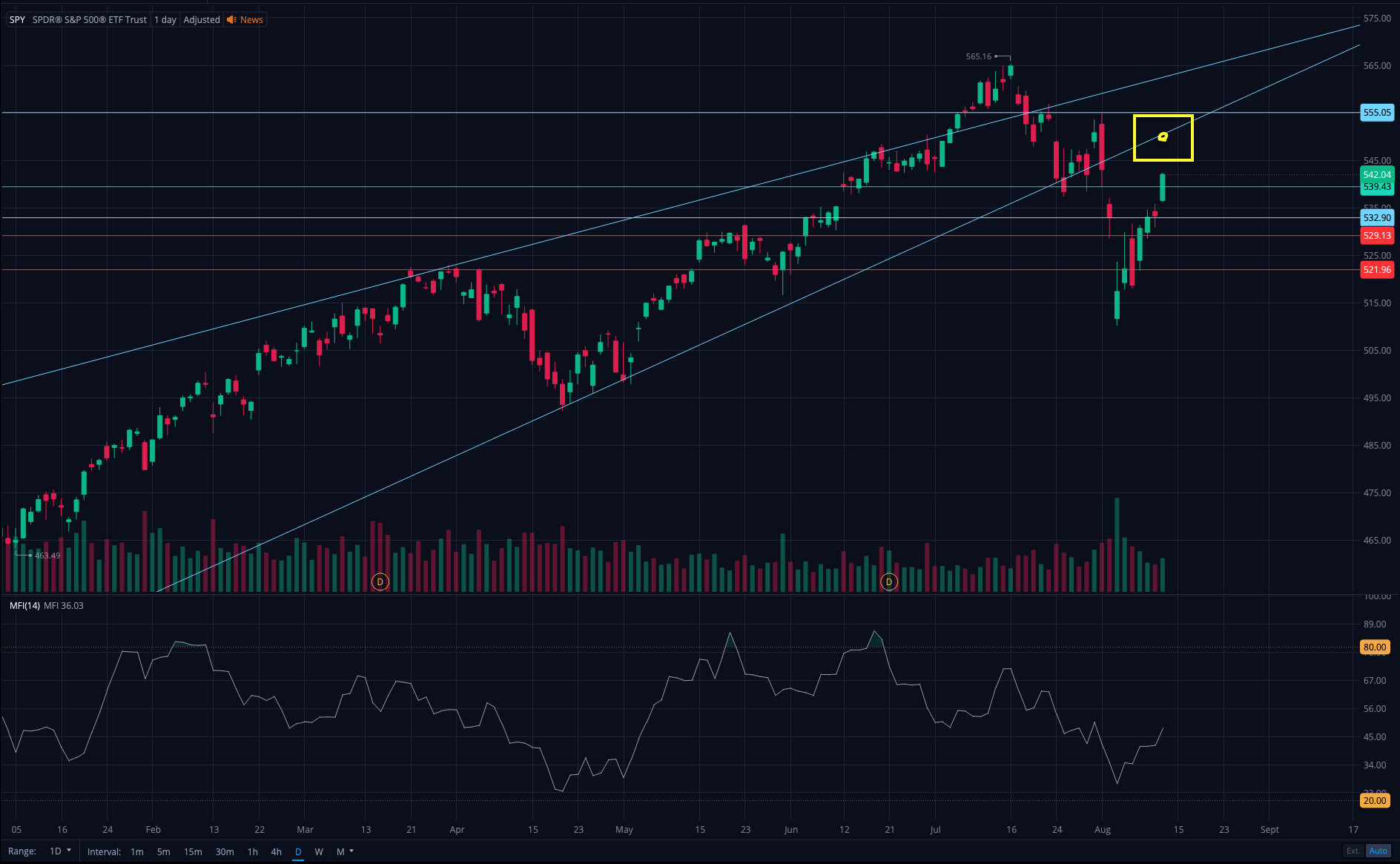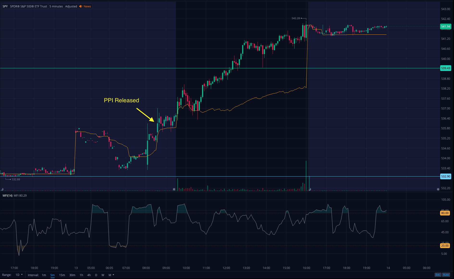 The reaction to the Producer Price Index (PPI) this morning was muted, but premarket movement brought SPY above yesterday’s high. Markets continued to rally after the open, and SPY closed above my 539 level from last night’s briefing.