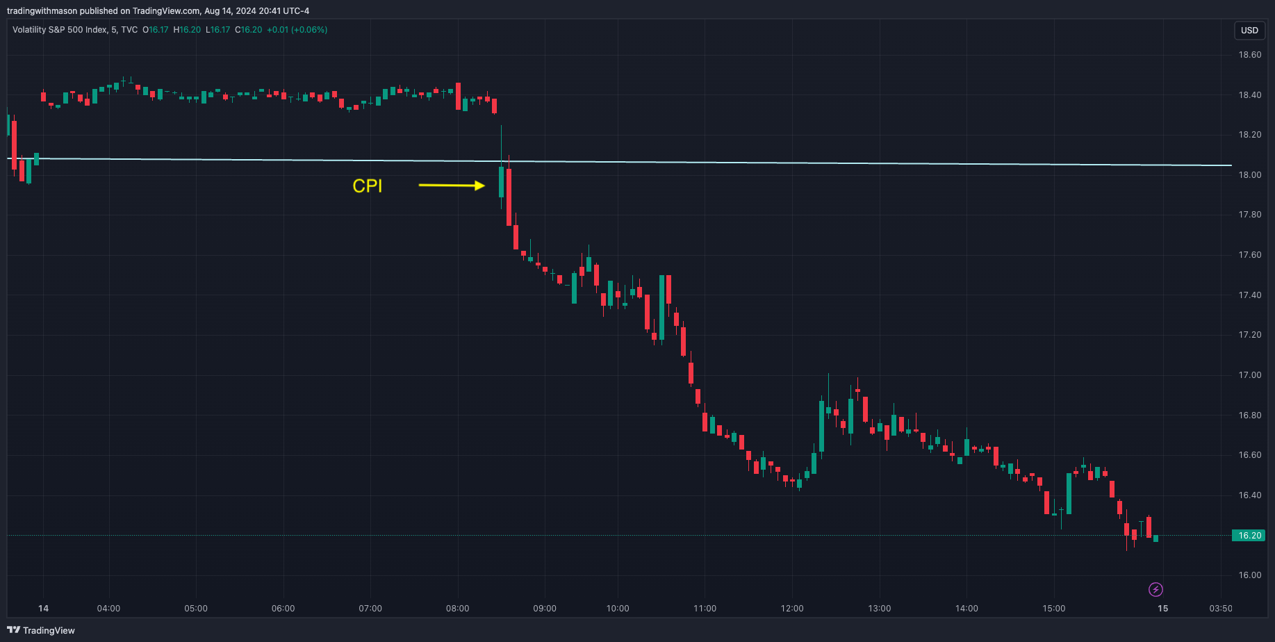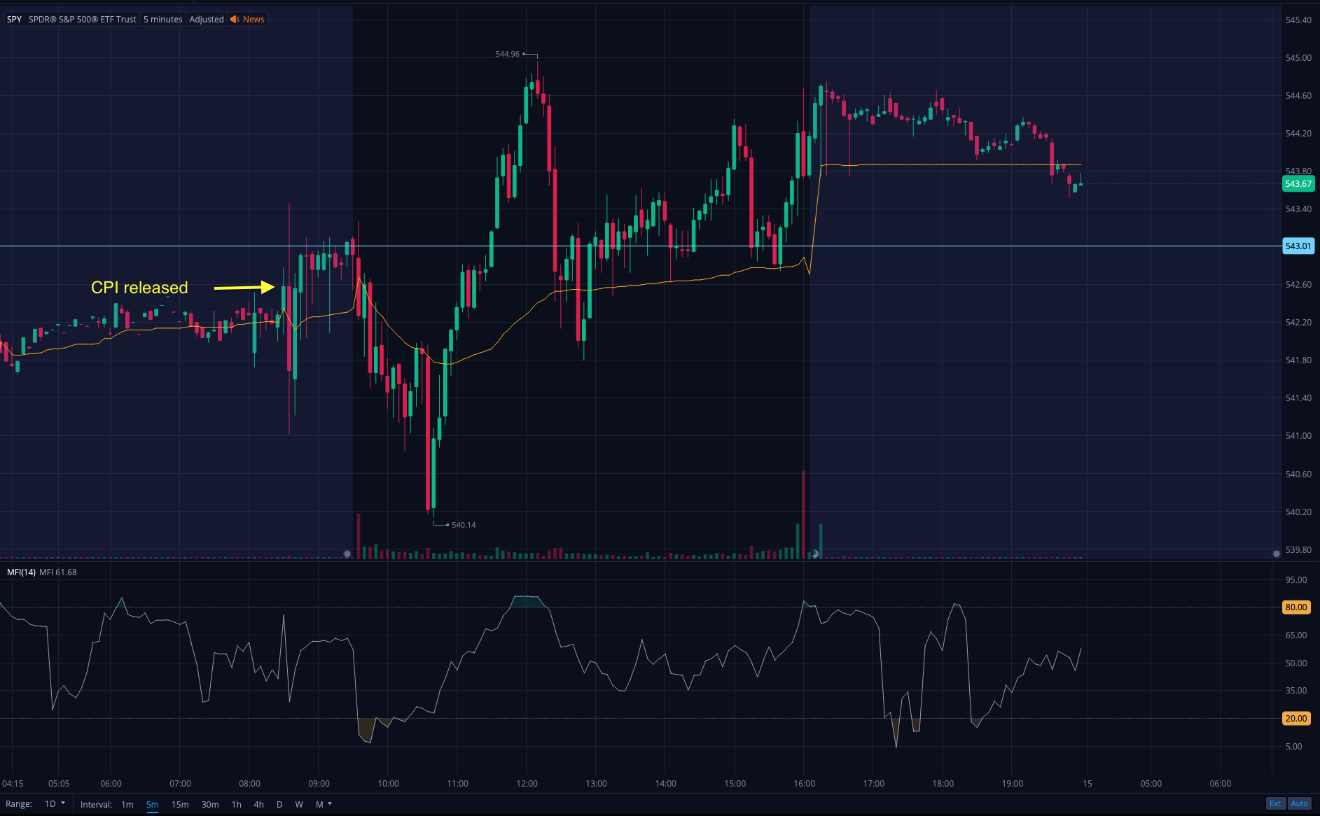 A significant factor that prevented me from shorting SPY after the first half-hour was the VIX losing its wedge support after the CPI release. As the VIX trended downward, seller exhaustion allowed bulls to take control, with buyers stepping in during dips throughout the day.