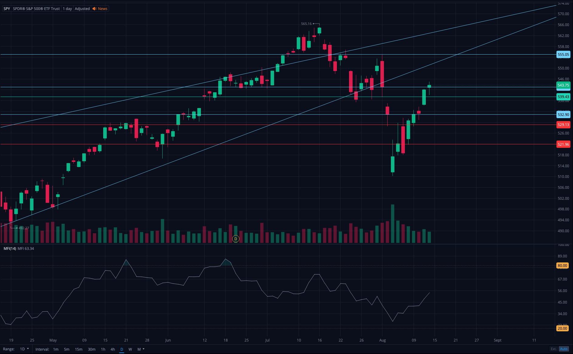 Looking ahead, I am interested to see where SPY will encounter resistance. I am watching the 543 level tomorrow for a strong open, and waiting to see whether bears will defend the 550 to 552 range into next week. Support levels to watch are 539 and 533.