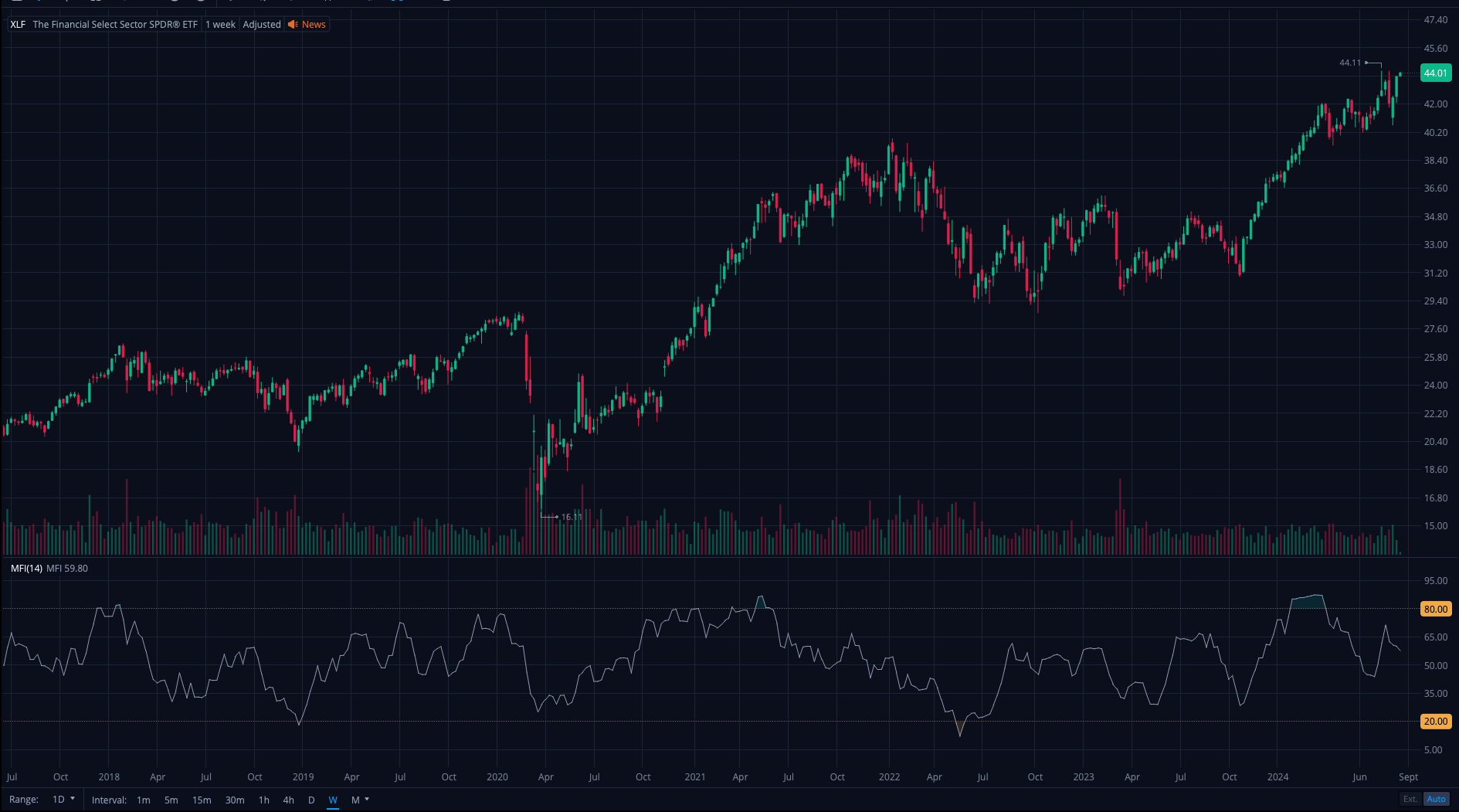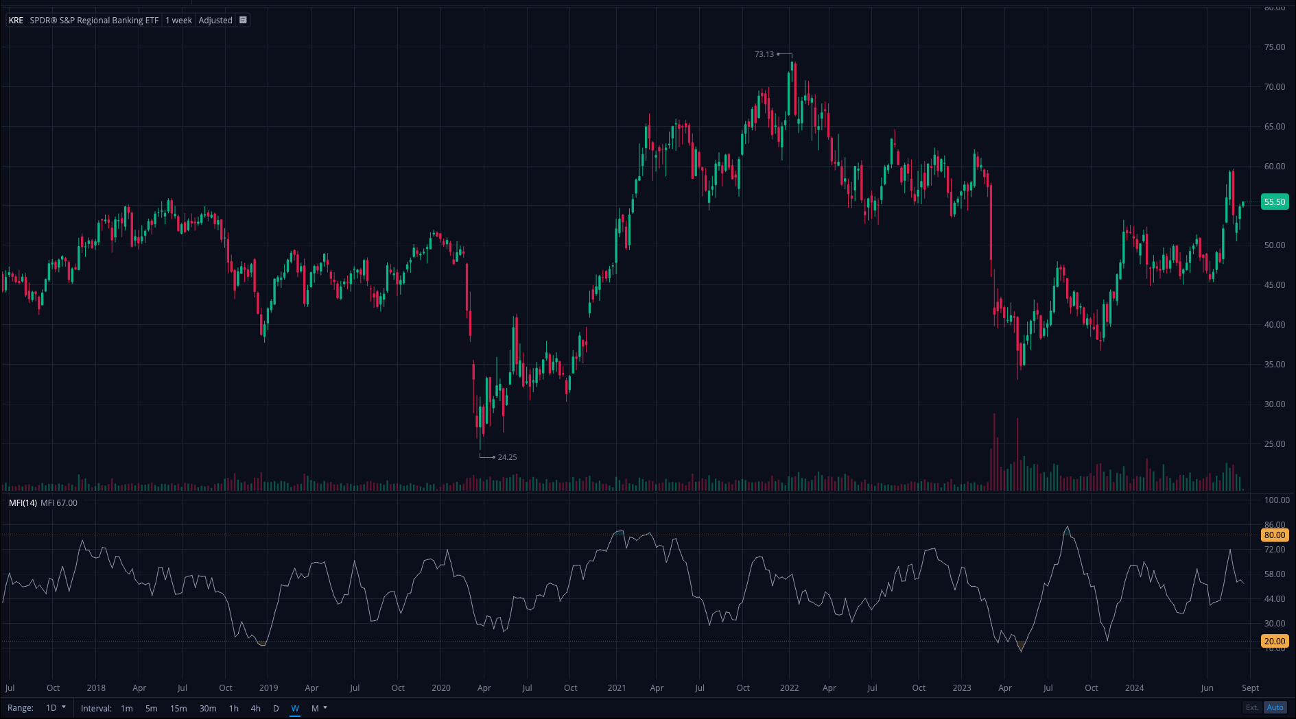 I also added some short shares of KRE today (regional banks). Regionals have underperformed larger banks, as seen in comparing KRE to XLF, which tracks the financial sector and banks like Goldman Sachs, Bank of America, and Wells Fargo.