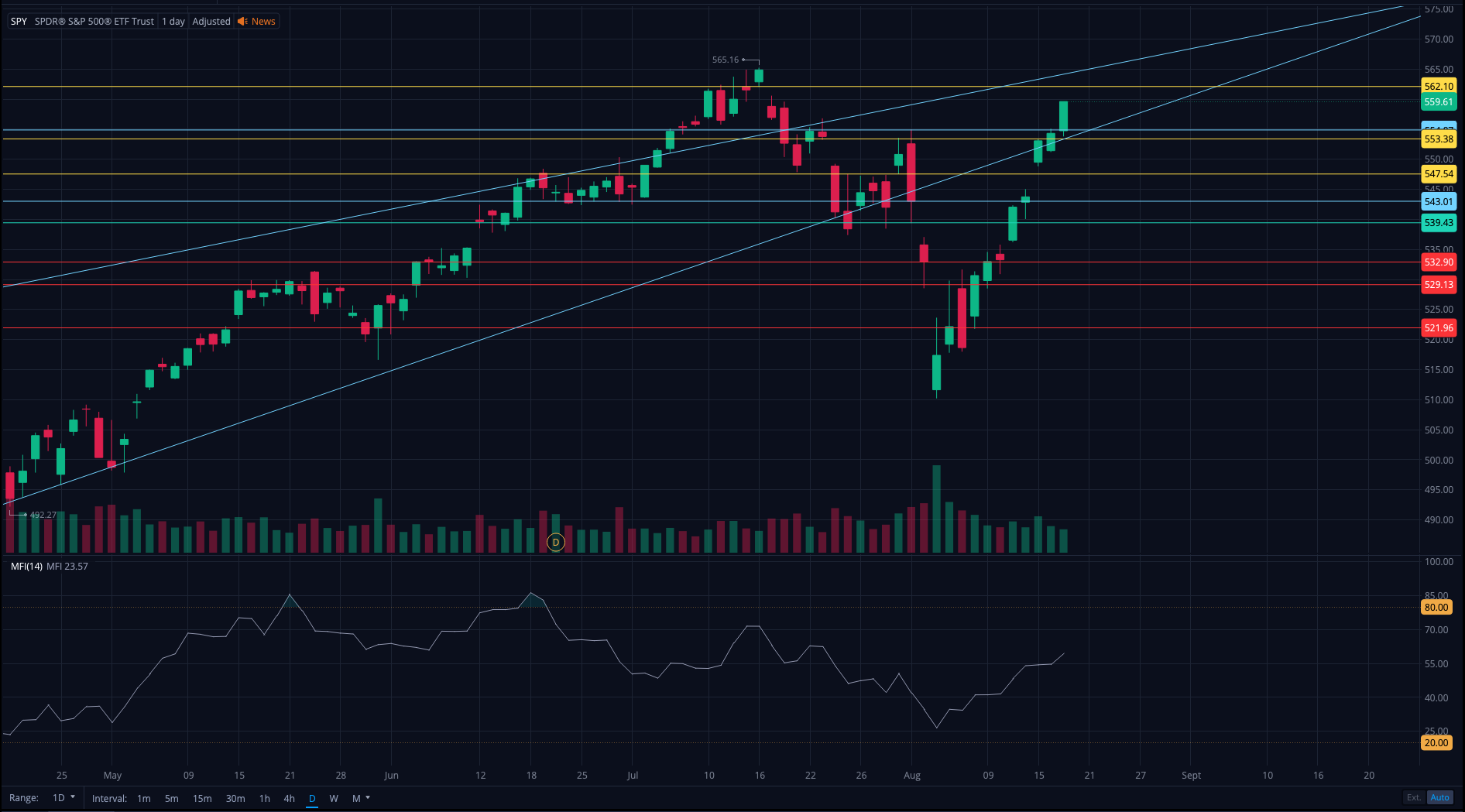 There’s not much to say about tonight as SPY continues sprinting toward all-time highs. There has been only one day of selling since we bottomed, and I’m not sure what is needed for SPY to find some resistance. Technicals haven’t played too much of a role in this recovery, but I’m watching the 562 and 565 levels for potential opportunities to add to my short positions.