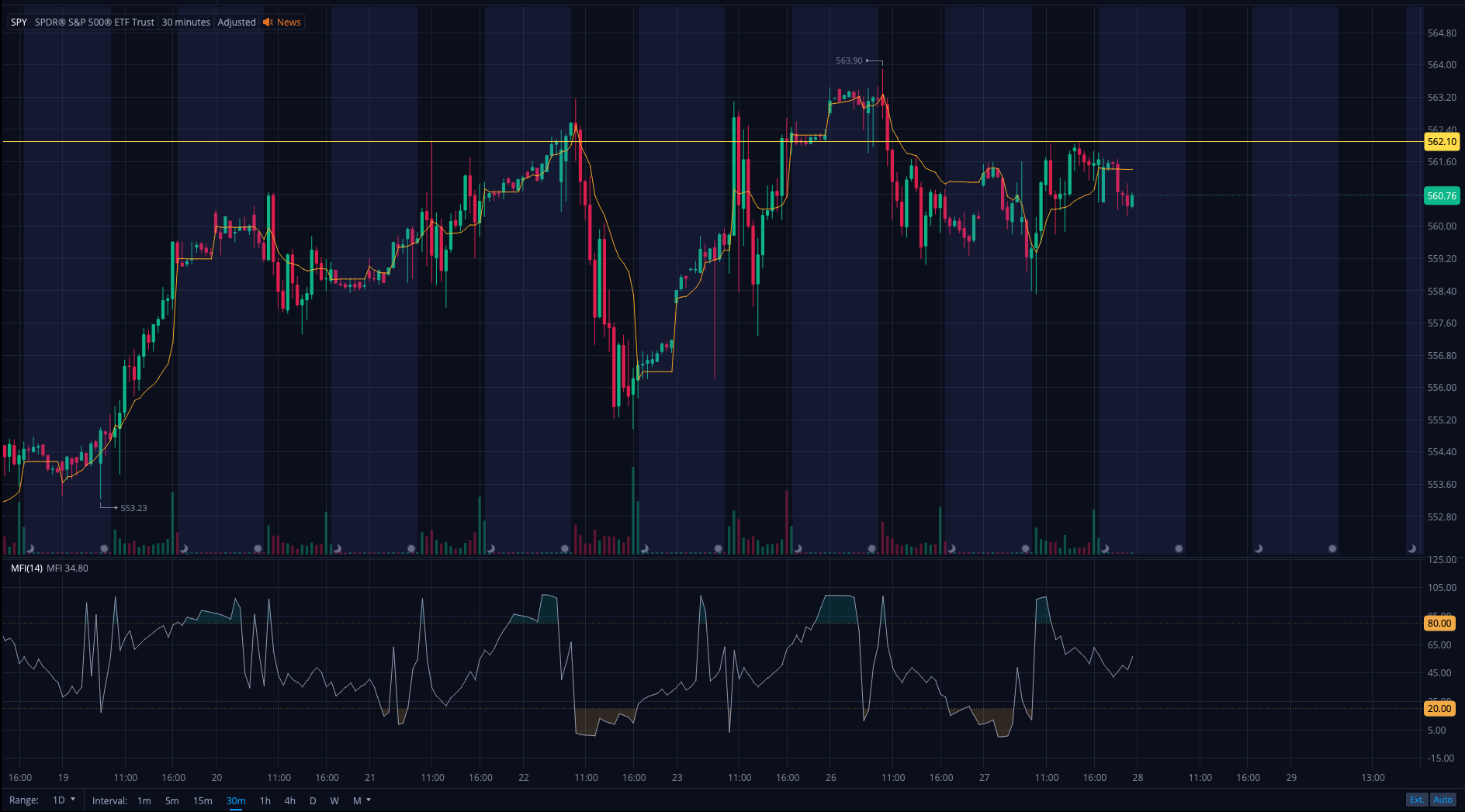 SPY has rejected 562 for five consecutive trading days and depending on how you draw the breakout line, the VIX is sitting right at support.