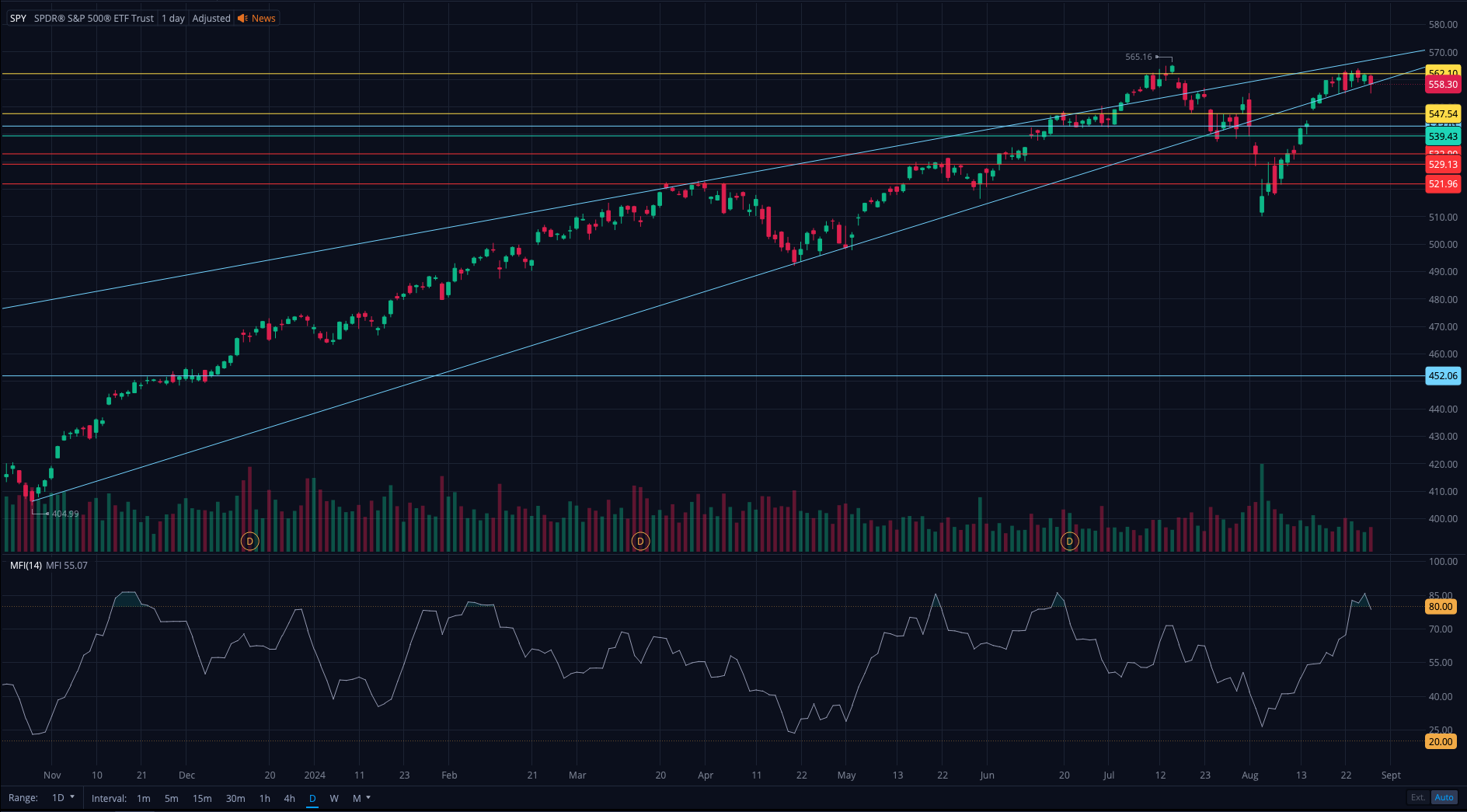 If SPY stays below the rising wedge tomorrow, 555 becomes my new top for short positions. When the market begins its correction, it might be hard to rely on bounces to add. Market sentiment has radically shifted in favor of bulls for the last few months, so each bounce may signal “recovery” to those who have become complacent in buying the dip.