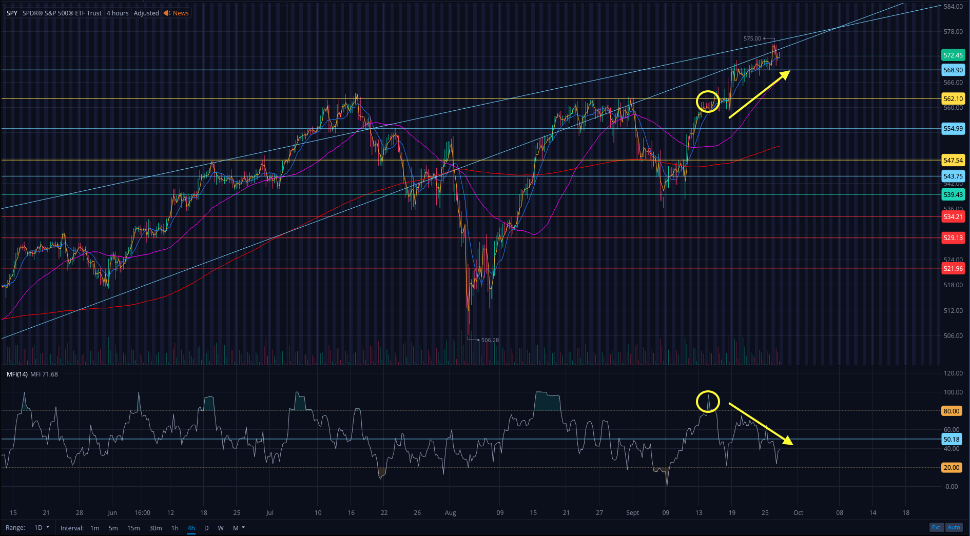 The S&P is holding above its upper trend line — a bullish sign — but daily MFI on SPY has slipped below 50. Momentum looks slow above the upper line of the channel.