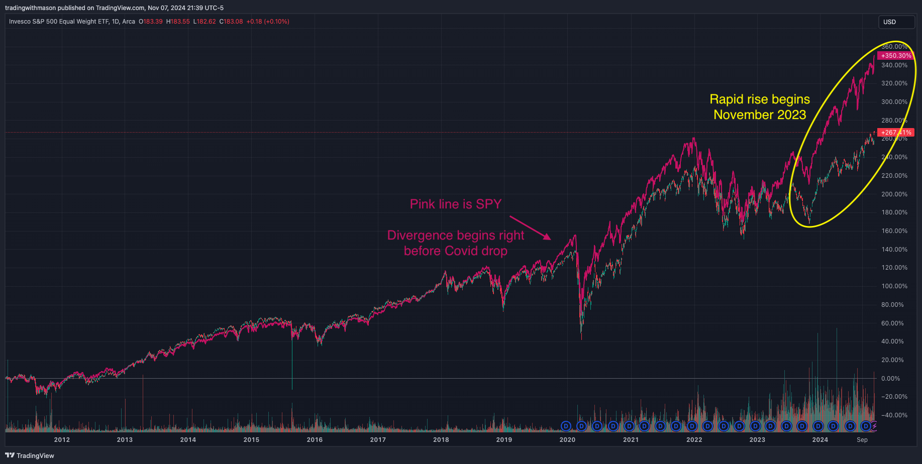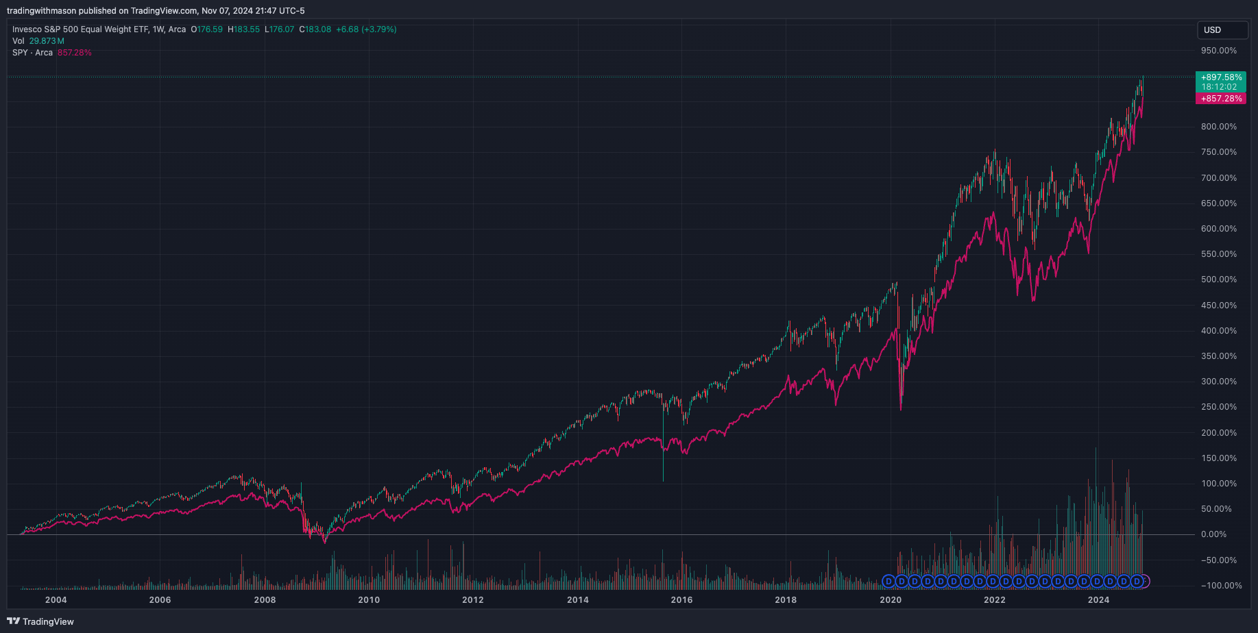 I only became familiar with the stock market in 2020, so my personal experience is still limited. However, I spend a lot of time analyzing historical trends and evaluating how the market reacts during specific situations. Let’s compare SPY to RSP, the equal-weighted S&P 500 ETF.