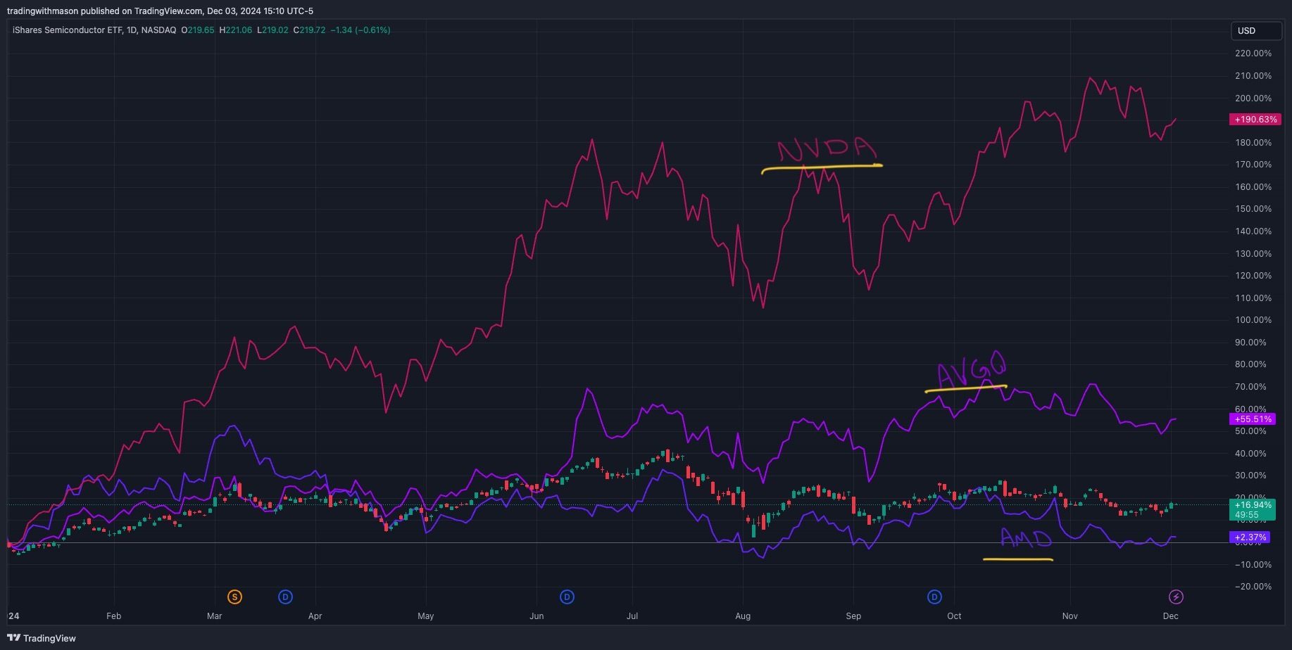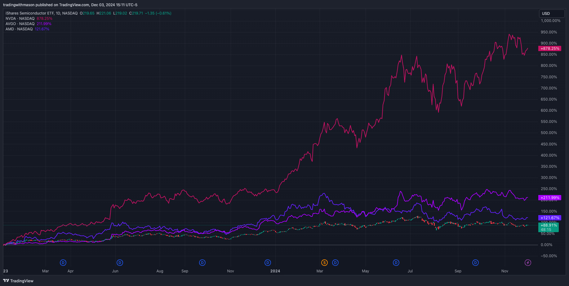 This optimism, while remarkable, seems to be focused on a select group of equities. Consider the iShares Semiconductor ETF (SOXX) compared to its top three holdings: