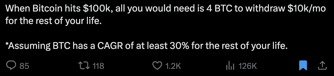 CAGR refers to the compound annual growth rate, and 30% is exceptionally high. For context, the historical CAGR of the S&P 500 is about 10% (not adjusted for inflation). Assuming Bitcoin will sustain a 30% CAGR for decades is bold. The reality is that there isn’t enough historical data to justify such a strong forecast. Still, many crypto enthusiasts believe 30% is relatively mild for its growth.